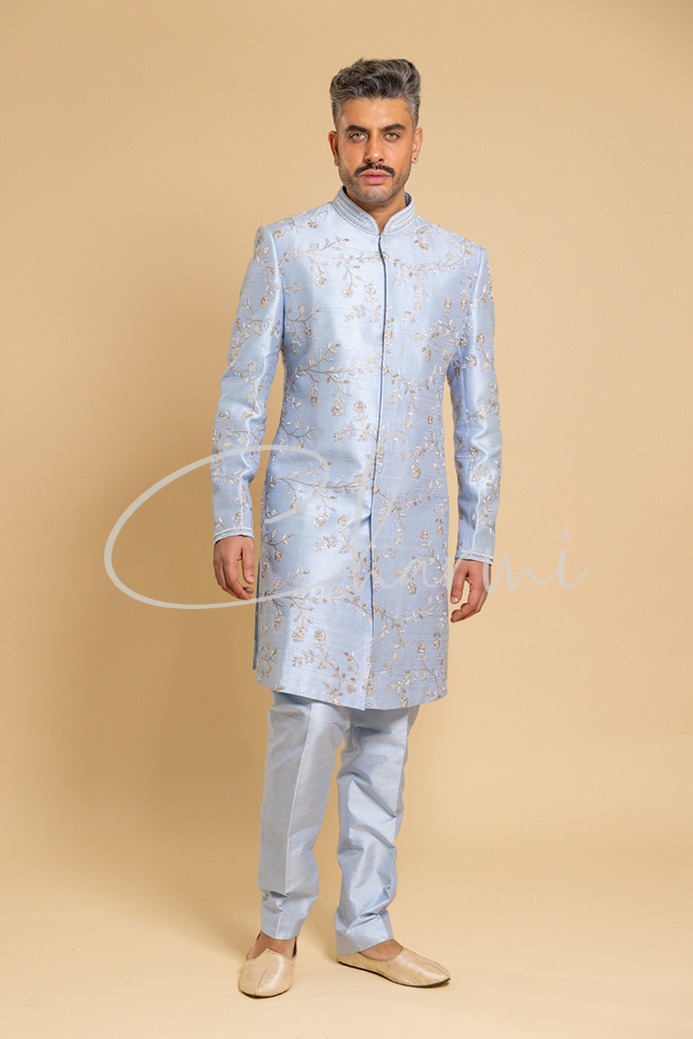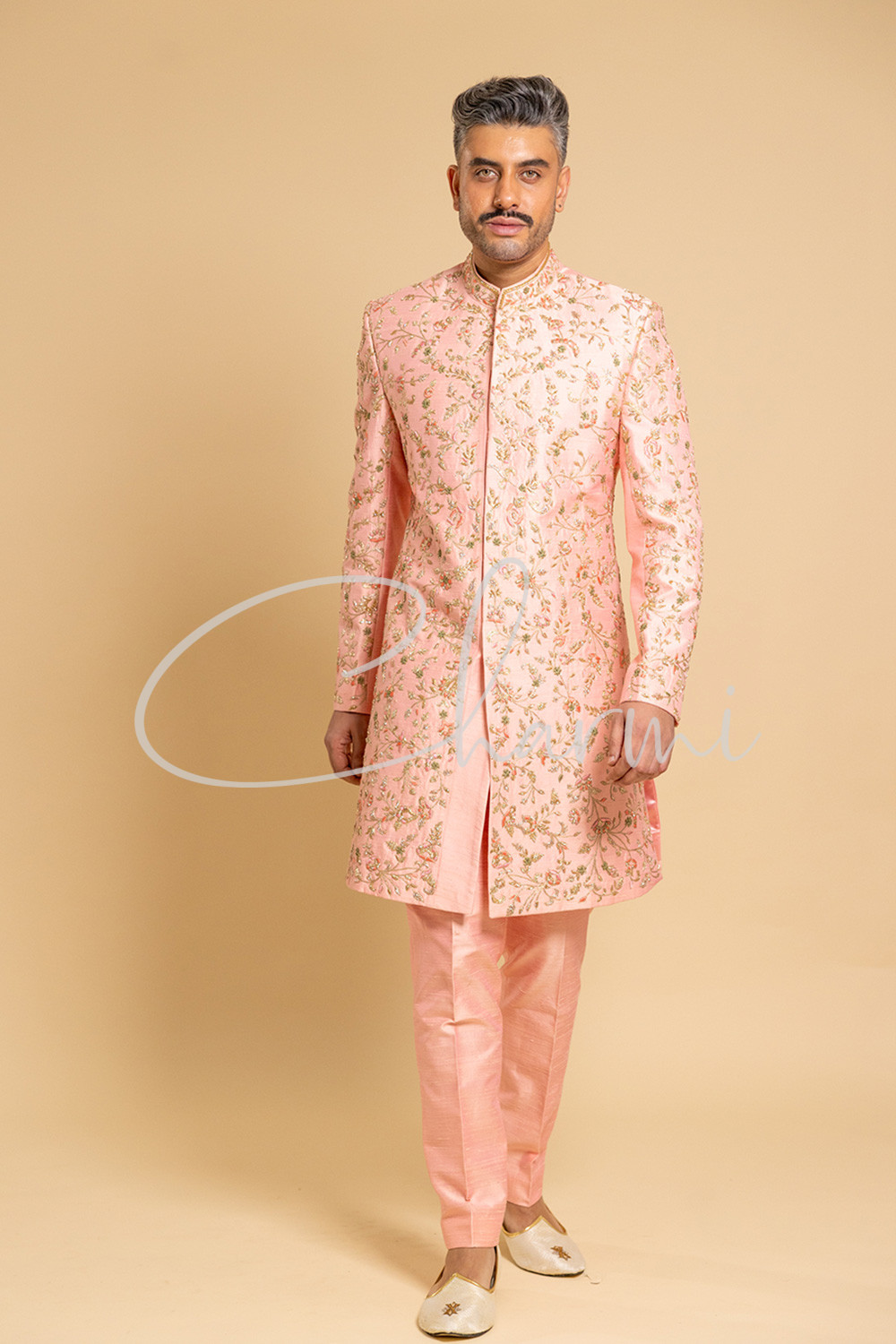 Charmi Creations offers grooms a perfect blend of traditional, modern and fusion menswear. These stunning wedding outfits, including sherwanis, jodhpuris, fusion mens suits and nehru suits, combine and blend Western cuts and styles with Eastern embroideries to create real statement pieces. Our Indian grooms wear collection offers traditional long sherwanis or Western style suits with shorter jackets to form the perfect men’s fusion wedding outfit.